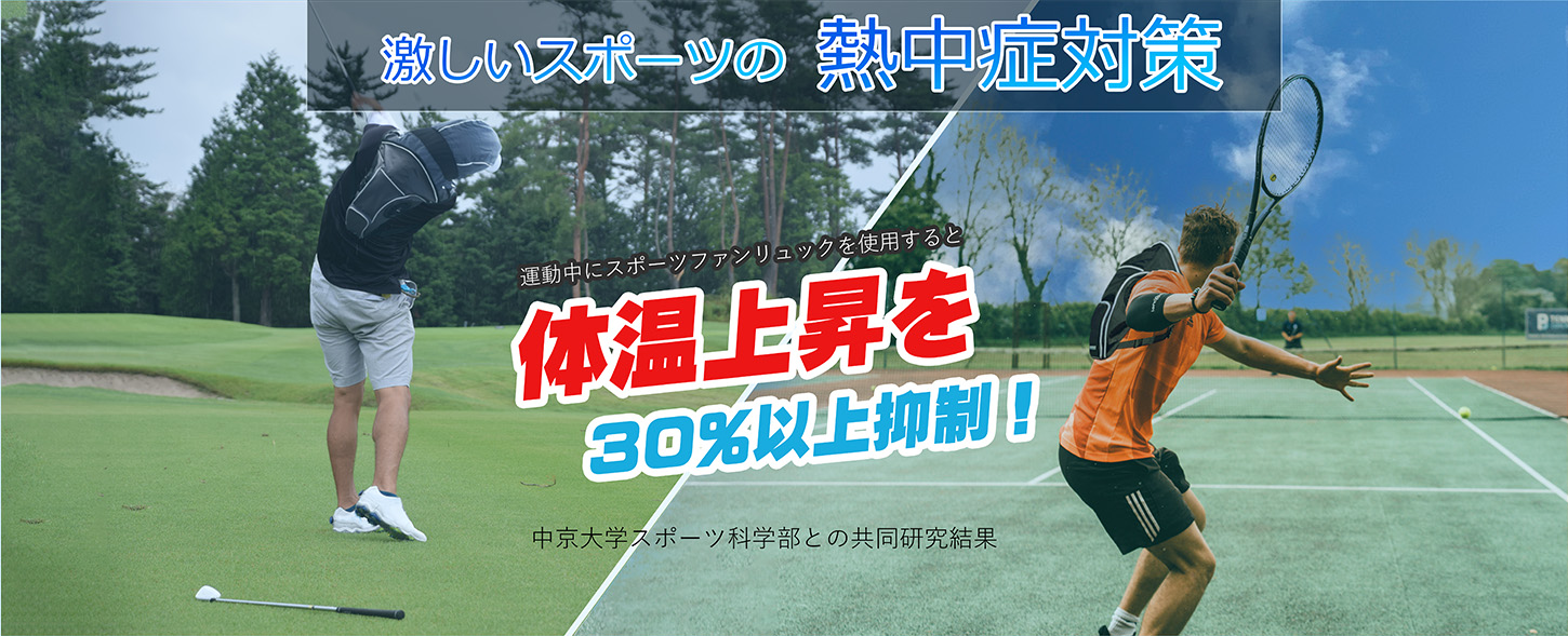 スポーツファンリュックは、リュックに付いたファンによって集中的に背部・頸(けい)部・頭部に風を送り込み、気化熱作用によって身体を冷却しています。中京大学スポーツ科学部との共同研究では、高温時の運動中においても深部体温上昇や心拍数上昇を抑制する効果があることがわかりました。